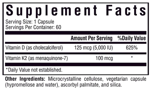 Vitamin D3 + K2 by Seeking Health contains 125 mcg (5000 IU) of D3 (as cholecalciferol) and 100 mcg of K2 (as menaquinone-7) in an easy-to-swallow capsule.The cholecalciferol form of vitamin D3 used in this product is derived from cholesterol in sheep's wool, making it suitable for vegetarians. Vitamin K2 is provided as menaquinone-7, one of the most studied forms of this important nutrient.*